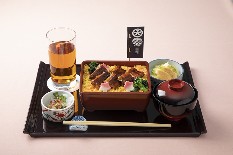 うなぎ蒲焼き6切れ・錦糸卵・菜の花・桜でんぶお重、うなぎの小鉢、お吸い物、香の物、グラスビールor ソフトドリンク