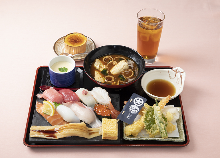 にぎり(本まぐろ中とろ・本まぐろ赤身・桜鯛・海老・オーロラサーモントロ・ヤリイカ・ブリトロ・イクラ・大煮穴子、出し巻)、天ぷら(海老×2、野菜、大葉)、茶碗蒸し、貝汁 or 赤だし、ブリュレプリン or ミルクソフト、ソフトドリンク or グラスビール