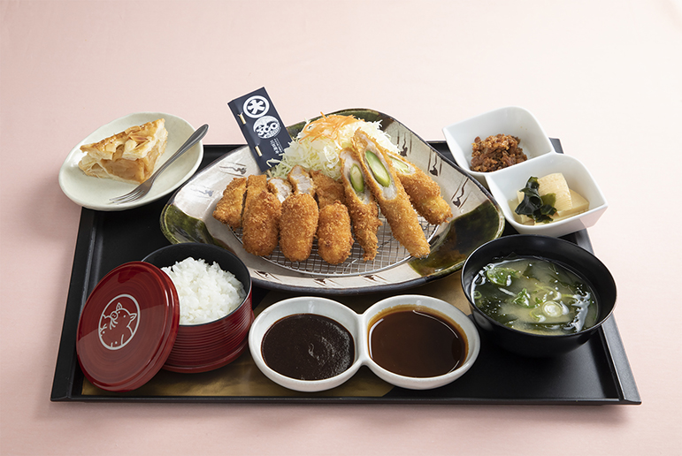 ミニとんかつ(80g)、カニコロッケ×3、豚肉巻きのアスパラガスフライ、おばんざい2種、ご飯物、桜漬け、みそ汁、アップルパイ