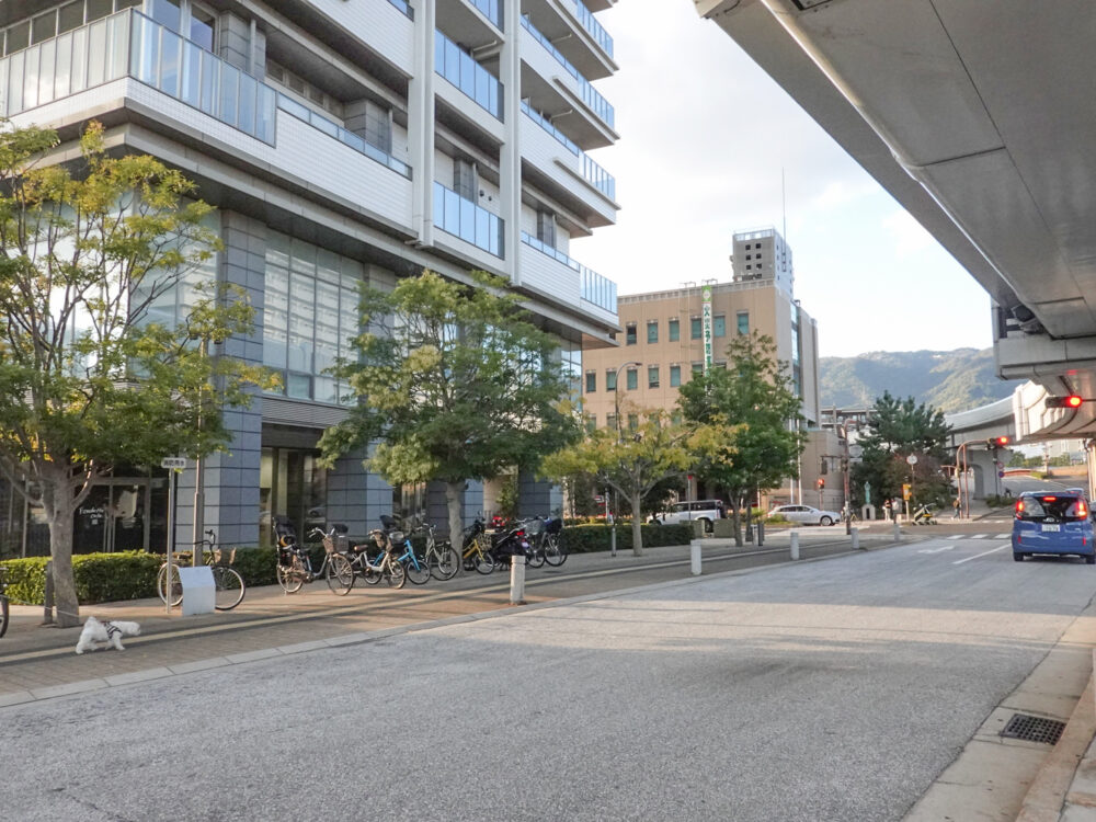 山側を向くとこんな感じで、交差点には「神戸市東灘消防署」や「東灘区役所」があるあたりです。