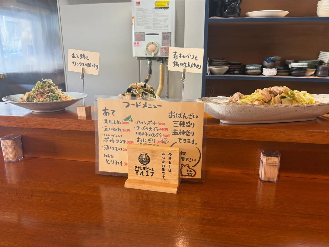 店内は、木製のカウンターにおばんざいが並んでいます。盛り合わせもできて、おばんざい3種にドリンク2杯ついた「せんべろ」セットもあるみたい。