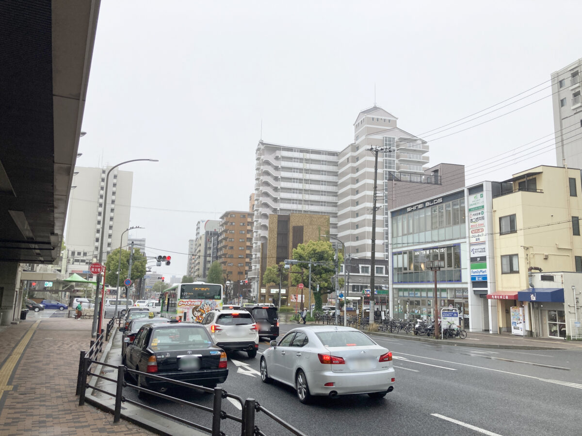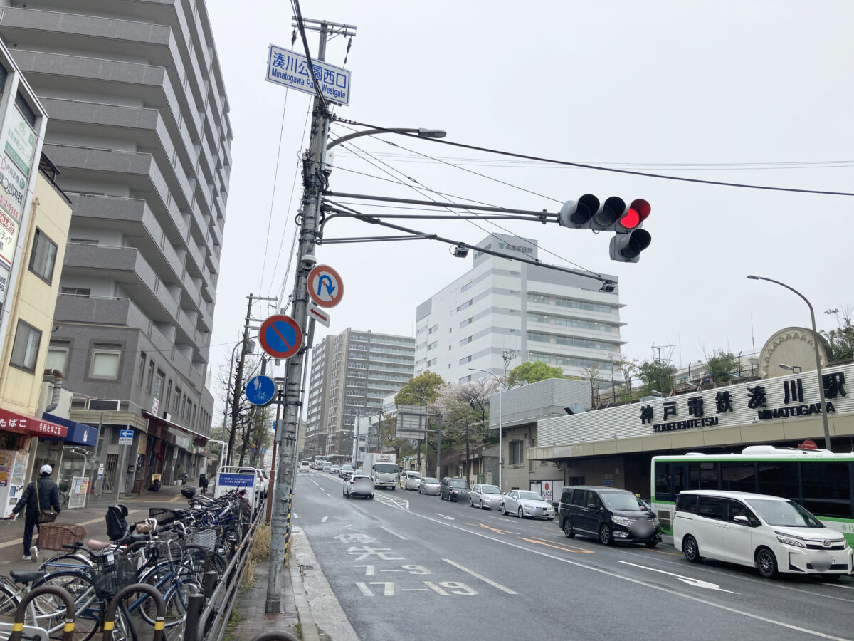 南を向くと、「湊川公園西口」の交差点があって、駅の西出口の階段もすぐそこ。さらに、まっすぐ行くと新開地の交差点がある方向です。