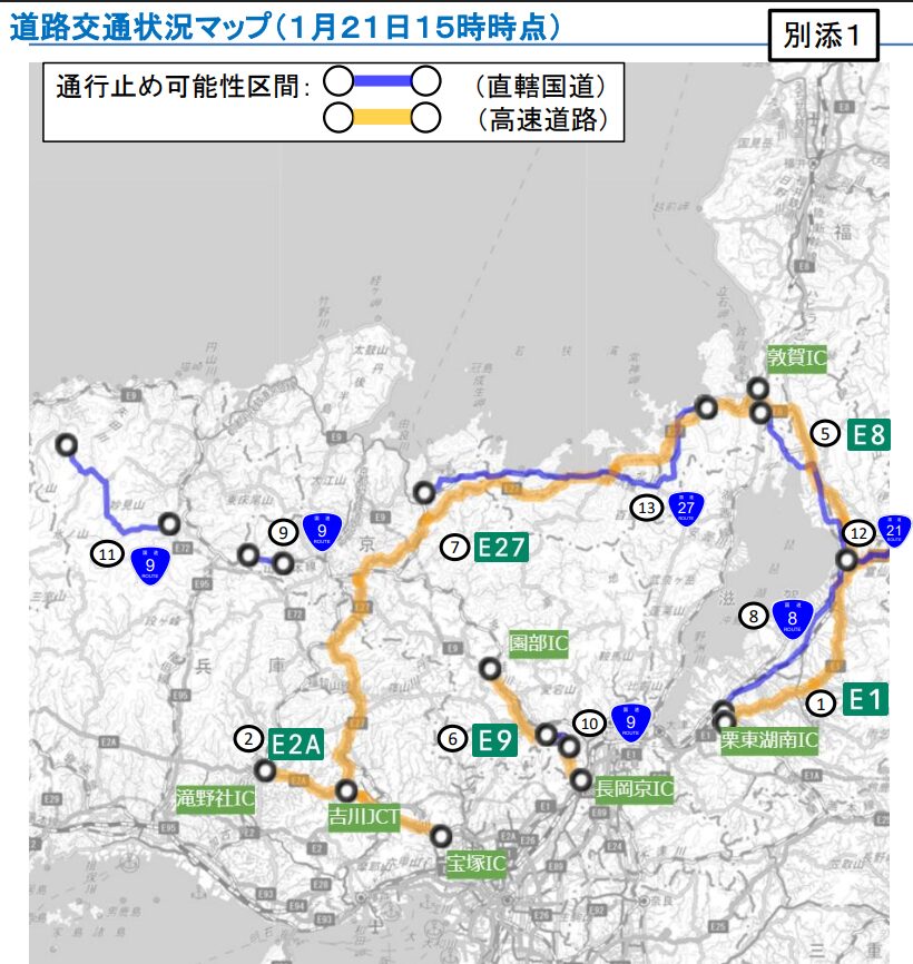 近畿圏では、国道9号・国道27号、舞鶴若狭自動車道、京都縦貫道等において早いところでは21日18:00~から。