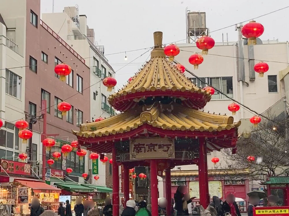 観光客で賑わう「南京町」でも、写真でもわかるほど大きめの「雪」が降り、しばらくすると服が濡れるほどでした。