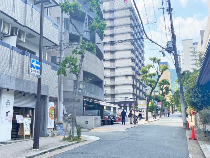 海側を向くとこんな感じ。向かい側すぐのところには生田神社の西門があります。