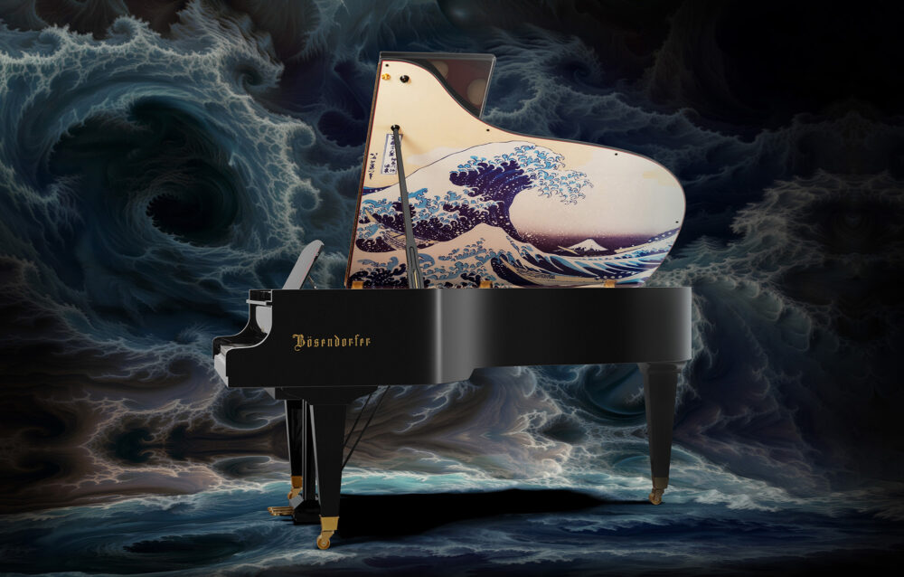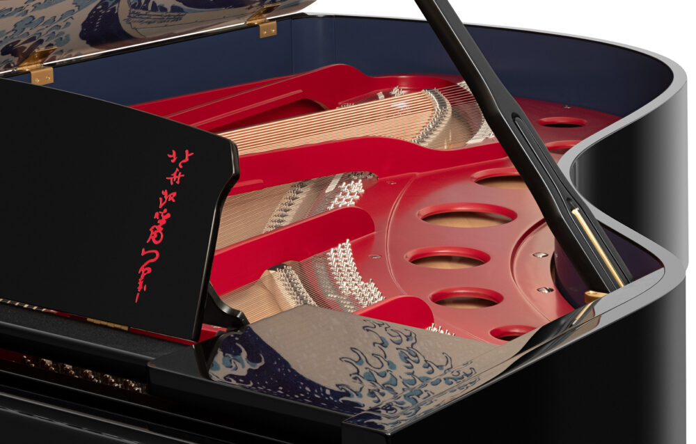 「The Great Wave off Kanagawa」というモデル名のとおり、江戸時代に活躍した浮世絵師・葛飾北斎の作品「神奈川沖浪裏」がピアノの屋根の内側に描かれてます。