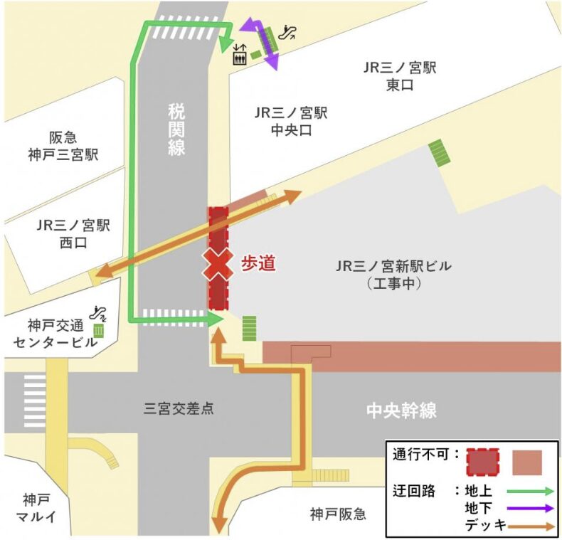 2025年11月から、三ノ宮駅の中央口から「神戸阪急」方面への最短距離となる歩道が「通行止め」となっています。