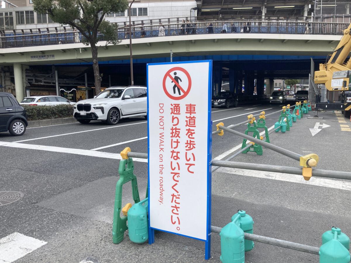 工事開始時からの変化としては、「車道を歩いて通り抜けないでください」という注意看板が追加されてます。