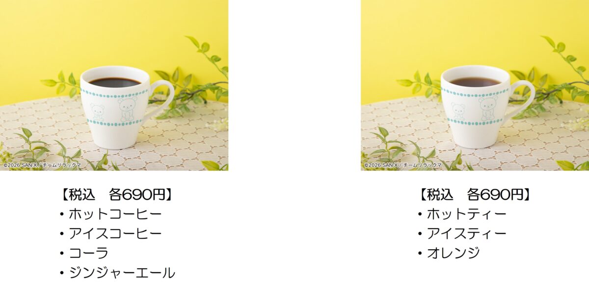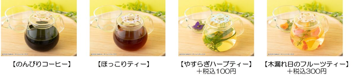 リラックマ・コリラックマ・キイロイトリから1種類選べるメインプレート、6種類の中から3種類を選べるサイドプレート、ドリンクを自由に組み合わせる「森のアフタヌーンティーセット」や、単品のドリンクメニューが楽しめます。