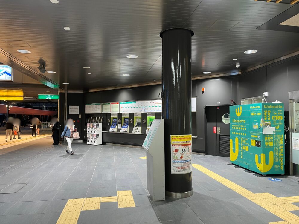 ロッカーが設置されてるのは、改札口のすぐ近く。ロッカーの隣に見える自動ドアは、駅員室に入るためのものです。