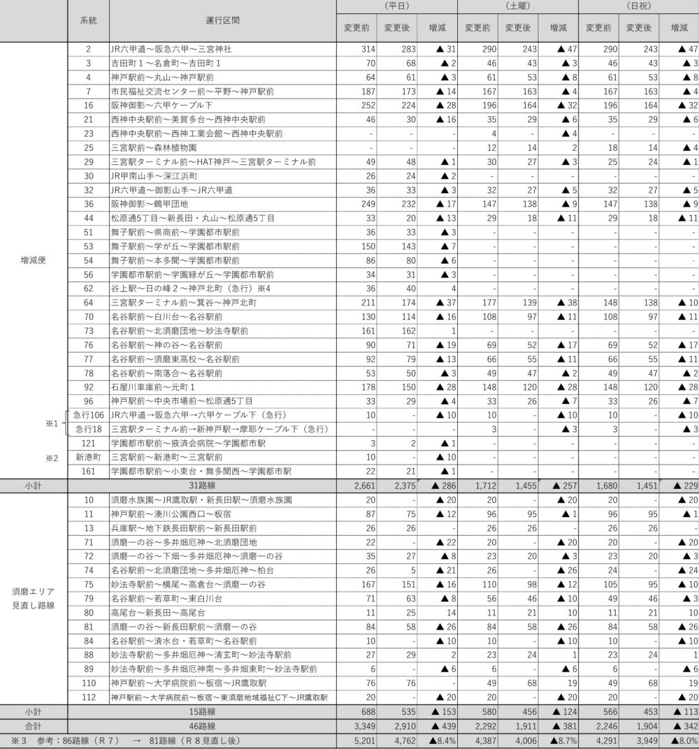 すでに発表されている「須磨エリア」のルート短縮や路線廃止も含まれた数ですが、生活への影響は大きそうですね。