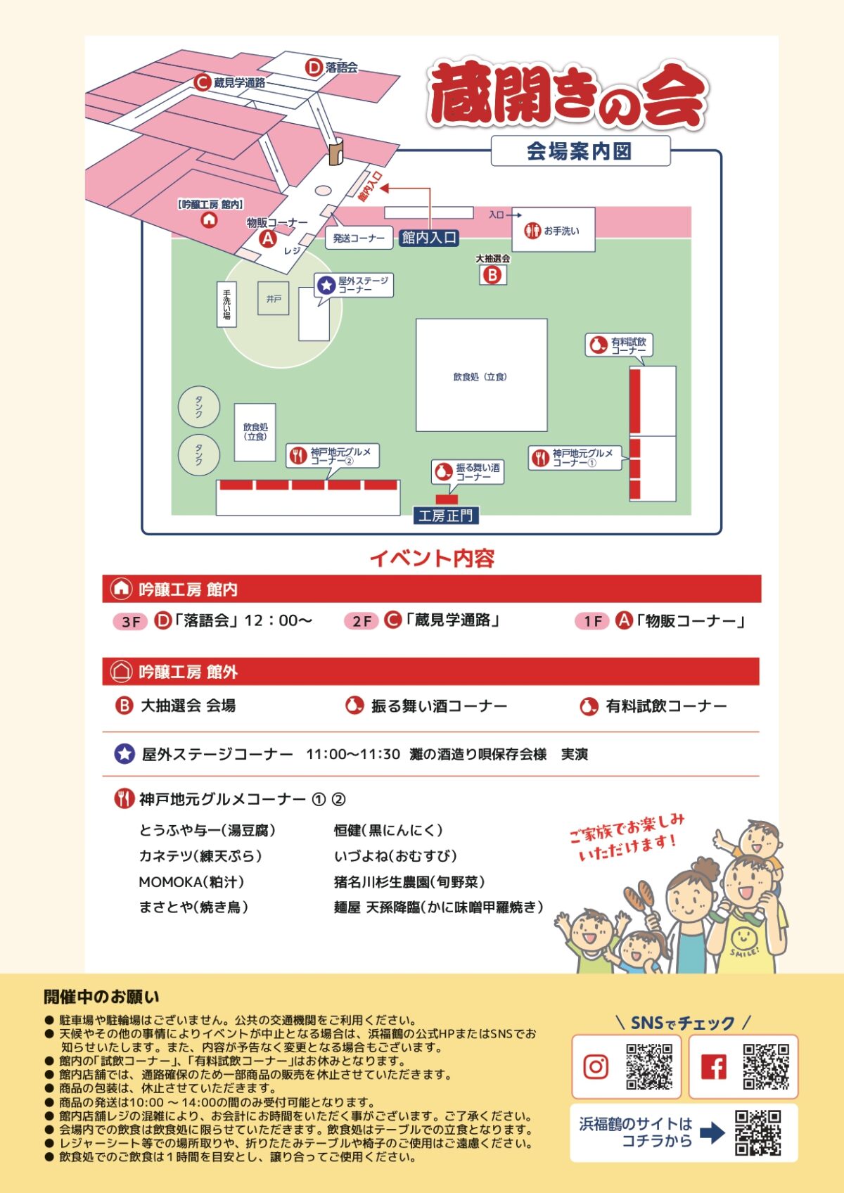 今回行われる「蔵開きの会」では、蔵開き限定の日本酒の販売、飲み比べ有料試飲のほか、酒造唄の実演や落語会、館内で3000円以上の買い物をすると参加できる「大抽選会」など、様々な企画が用意されてます。