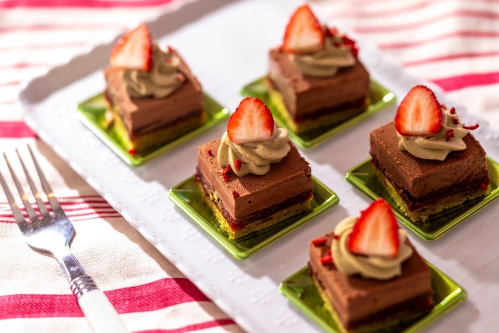 ピスタチオのビスキュイにいちごのコンフィチュール、カリッとした食感のプラリネフィユティーヌにミルクチョコレートのムース、ピスタチオクリームで5層仕立ての繊細なスイーツです。
