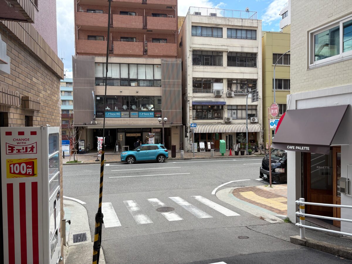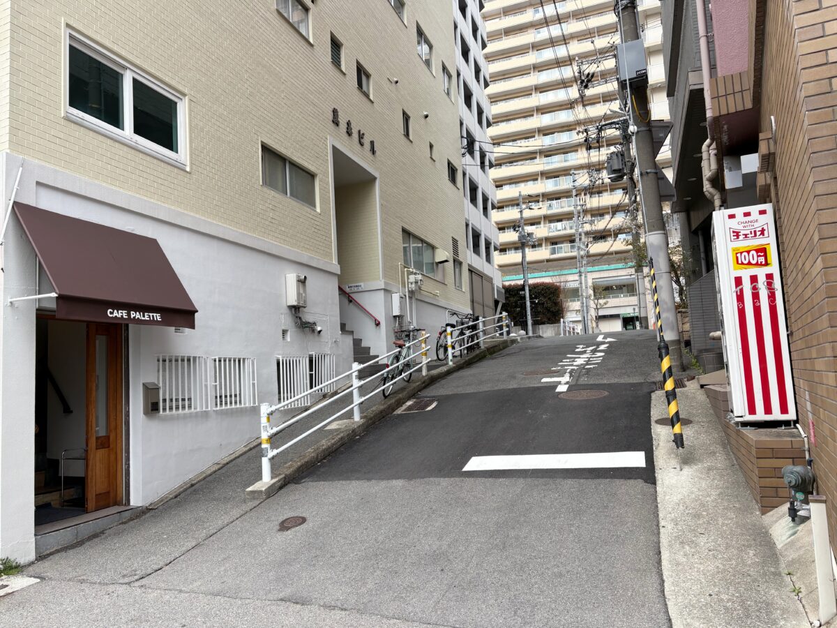 お店の北側は、こんな感じ。坂を登った先にあるのが「トア山手ザ・神戸タワー」で、二郎系ラーメンのお店「ジャンクマン」や「日本料理十三蔵」など、様々な飲食店が並んでいます。