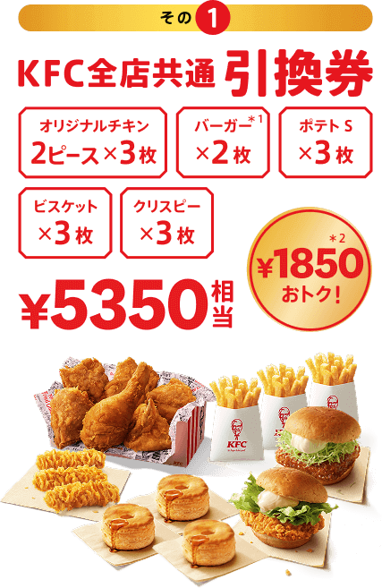 福袋には、「オリジナルチキン」や「バーガー」をはじめとした人気定番メニューのKFC全店共通引換券(5,350円相当)が入っていて、この時点で「1,850円」お得になっています。