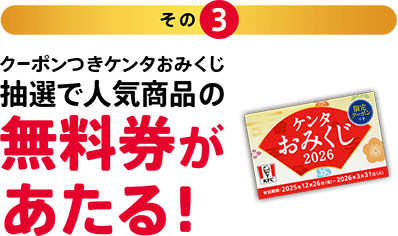 さらに、今年も抽選で人気商品の無料券が当たる「クーポンつきケンタおみくじ」が入っています。