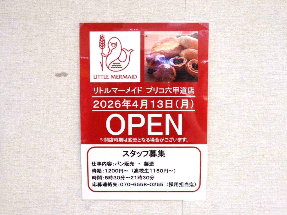 JR六甲道駅のすぐ近く、プリコ六甲道 中央館の2階に、ベーカリー『リトルマーメイド』ができるみたいです。