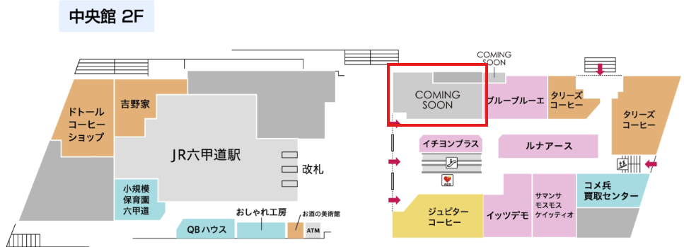 お店ができるのは、プリコ六甲道 中央館の2階の自動ドアすぐそば。北口も近くに見えてます。