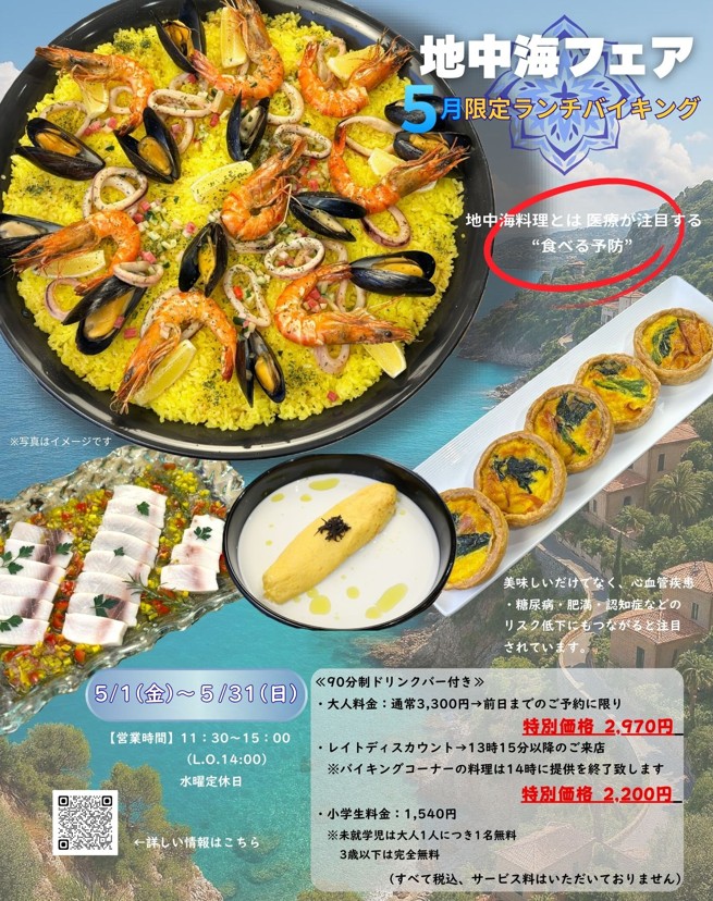 各線 明石駅から歩いてすぐ、「明石城跡」前にある「グリーンヒルホテル明石」で、5月限定ランチバイキング『地中海フェア』が開催されます。