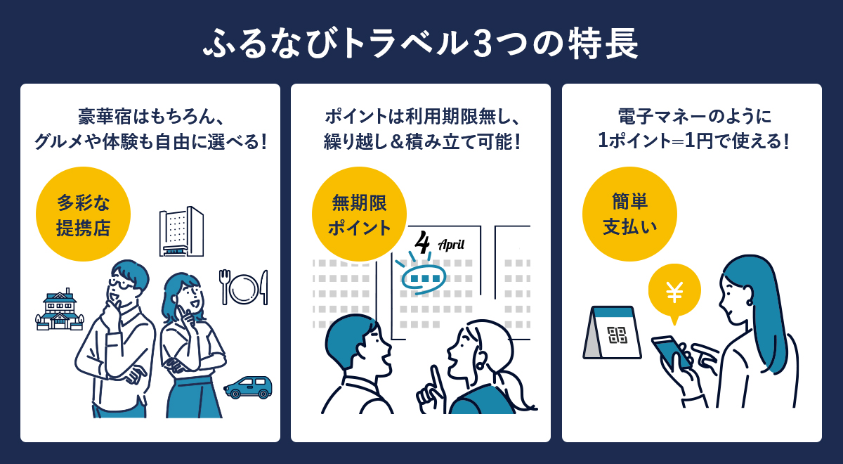 旅行体験型ふるさと納税「ふるなびトラベル」とは「ふるなびトラベル」は、ふるさと納税の寄附で得たふるなびトラベルポイントを、提携店(ホテル・飲食店・アクティビティ施設など)でのお支払いに無期限で利用できるサービス。