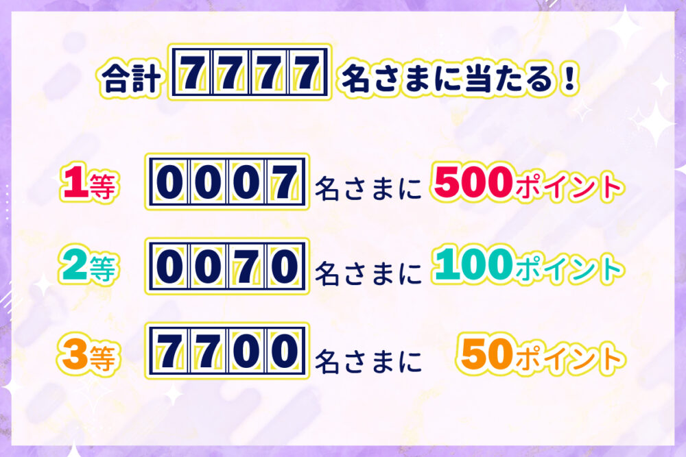 1等が当たれば、500ポイントがもらえます。当選人数は、合計で7,777人です。