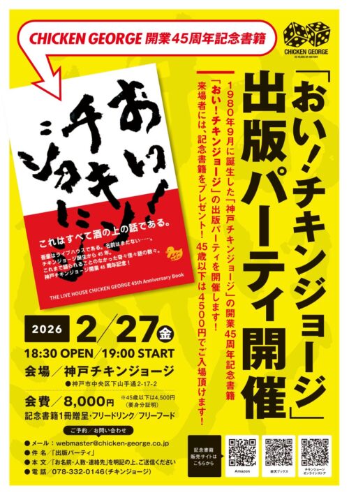 45年の長きにわたり、日本の音楽シーンを支えてきたライブハウス「神戸チキンジョージ」。その歴史が詰まった45周年記念書籍「おい!チキンジョージ」が、2026年2月27日(金)に発売されます。