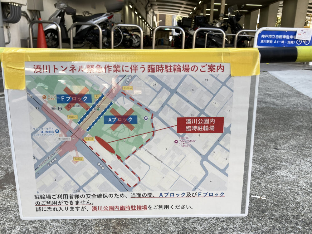 トンネル下の「駐輪場」も利用できなくなっていて、湊川公園の南西部分が「臨時駐輪場」となっています。
