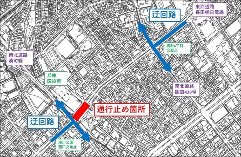 地図で見るとトンネル全体が車・歩行者ともに「通行止め」となり、車は東西の大きい交差点「楠町6丁目交差点」「湊川公園西口交差点」での迂回が推奨されてます。