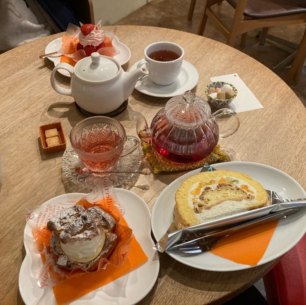 入口付近には生ケーキのショーケースや焼き菓子が並び、奥に進むとイートインのテーブル席が7台ほど置かれています。コロナ禍でしばらくカフェ利用は停止していたのですが、2025年夏頃から再開しました。