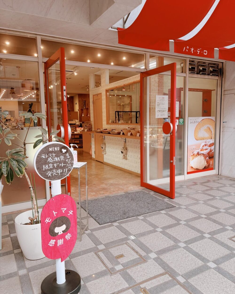 『パオ・デ・ロ』は、元町商店街5丁目にある町のケーキ屋さん。赤い看板が目印で、ガラス張りのドアからも店内のゆったりとした雰囲気が分かります。