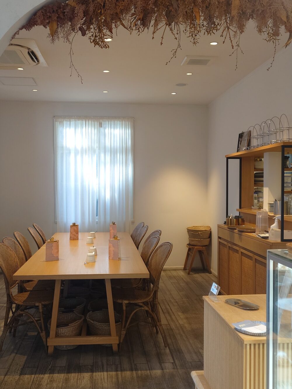 可愛らしい白を基調とした店内には、ドライフラワーや木製の家具が並び、生ケーキ以外にも、焼き菓子やパンが販売されています。