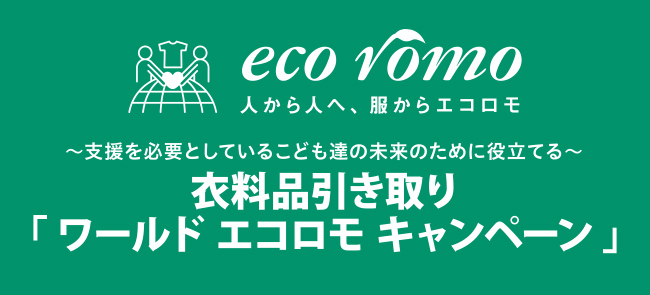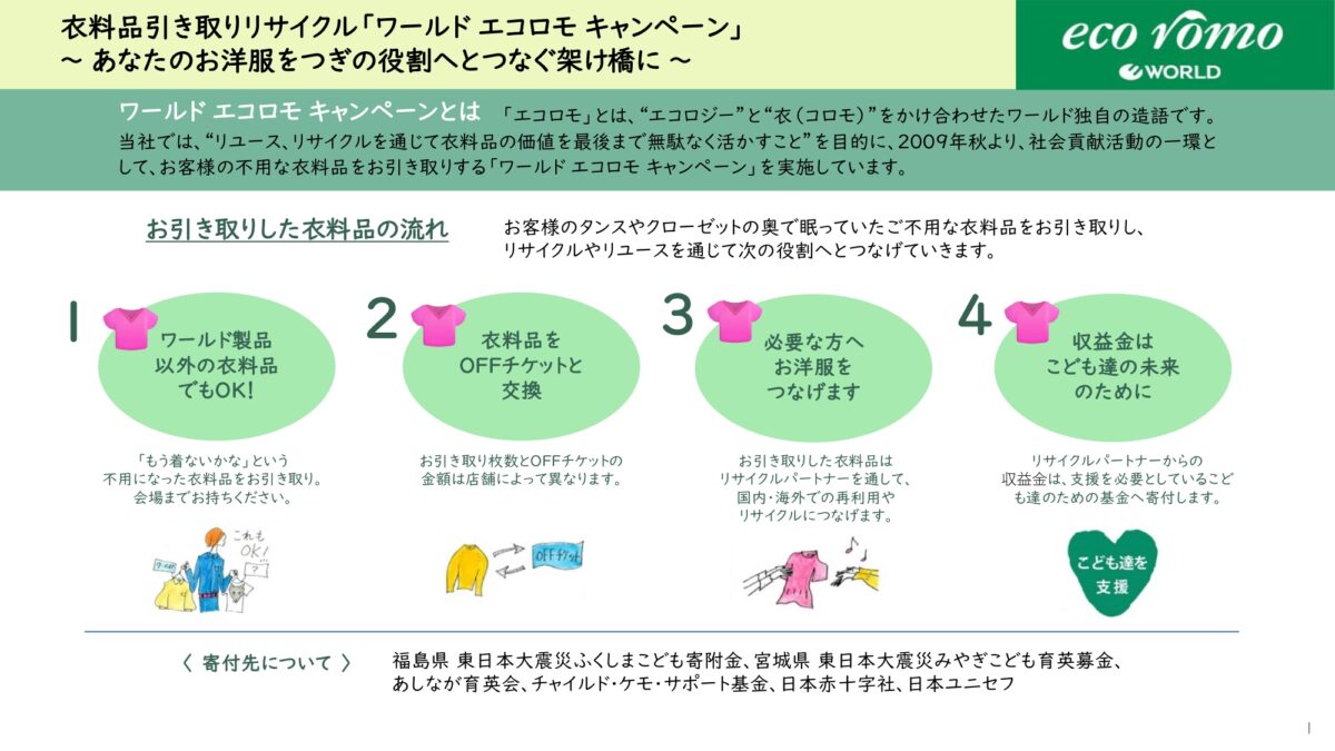 「エコロモ」とは、“エコロジー”と“衣(コロモ)”をかけ合わせた「ワールド」グループ独自の造語とのことで、社会貢献活動の一環として不用な衣料品を引き取り、リサイクルパートナーと連携してリサイクル・リユースを行っています。