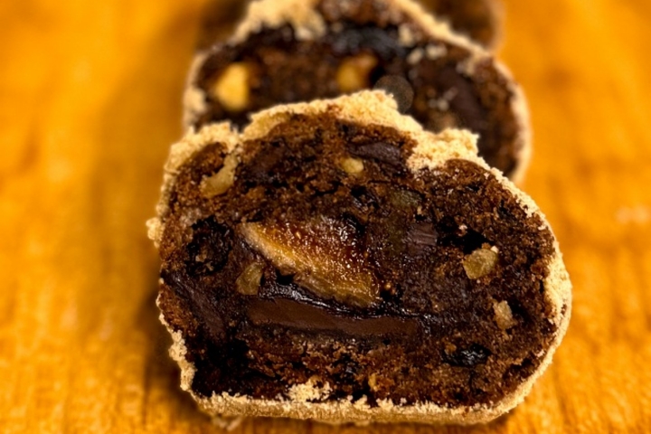 イースト不使用(自家製酵母使用)、古代小麦、鹿児島の未精製糖、室戸の海洋深層水の塩が使用されています。クーベルチュールを使用し、自家製赤ワイン煮いちじくなどと一緒に焼きあげているのだとか。