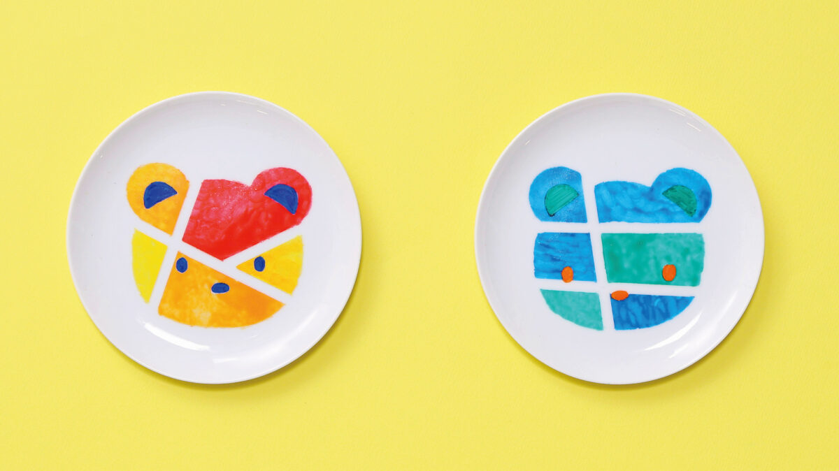 カラフルなクマちゃんのお顔が描かれたオリジナルのお皿をつくろう!型やテープでブロッキングをしたお皿に、専用の絵の具で自由に色を塗っていきます。型を外したらどんなクマちゃんのお顔が現れるか、色の重なりにも注目しながら楽しめそうです。