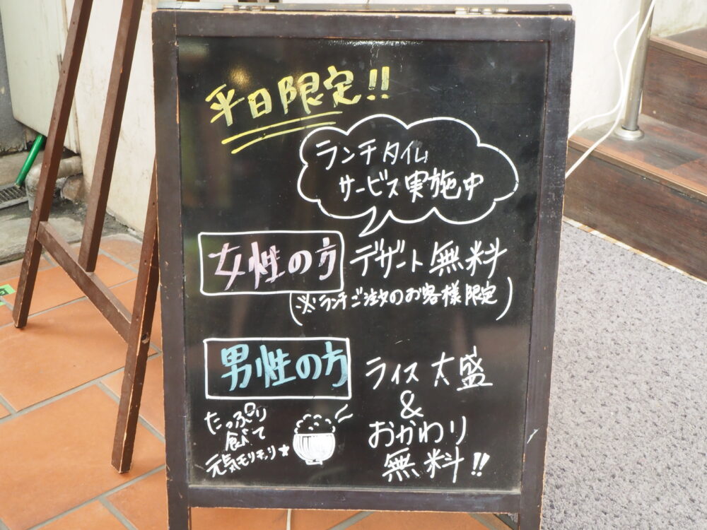 また、平日のランチ限定で女性はデザート無料、男性はライス大盛&おかわり無料といったうれしいサービスも!