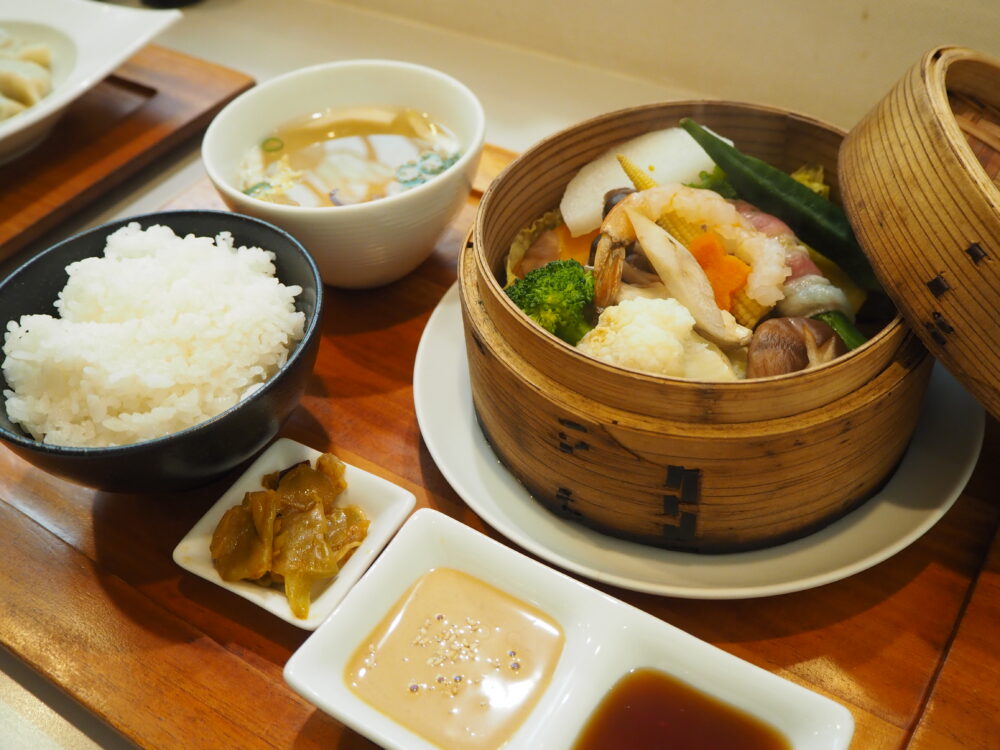 「季節のお野菜のセイロ蒸し(1,100円)」は季節ごとに変わる野菜が楽しめます。セイロの中にはかぼちゃや白菜といった、体が温まる食材がふんだんに使われています。