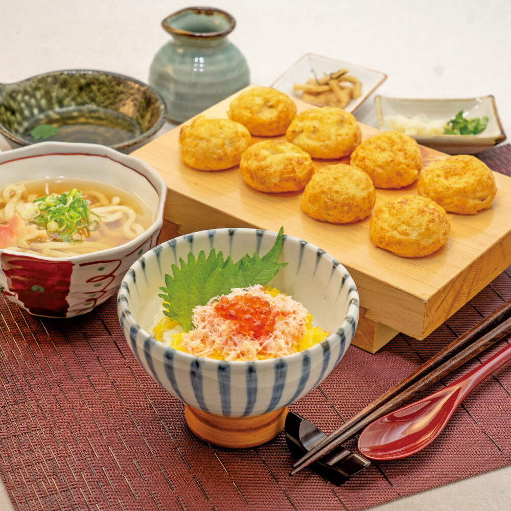 甘みたっぷりの紅ズワイガニとプチプチ食感のいくらの濃厚な海の幸を味わい丼と特製お出汁が効いた、ふわとろ食感の名物玉子焼(明石焼)、温かいお出汁香るうどんが付いた旬を味わう玉子焼セットメニューです。