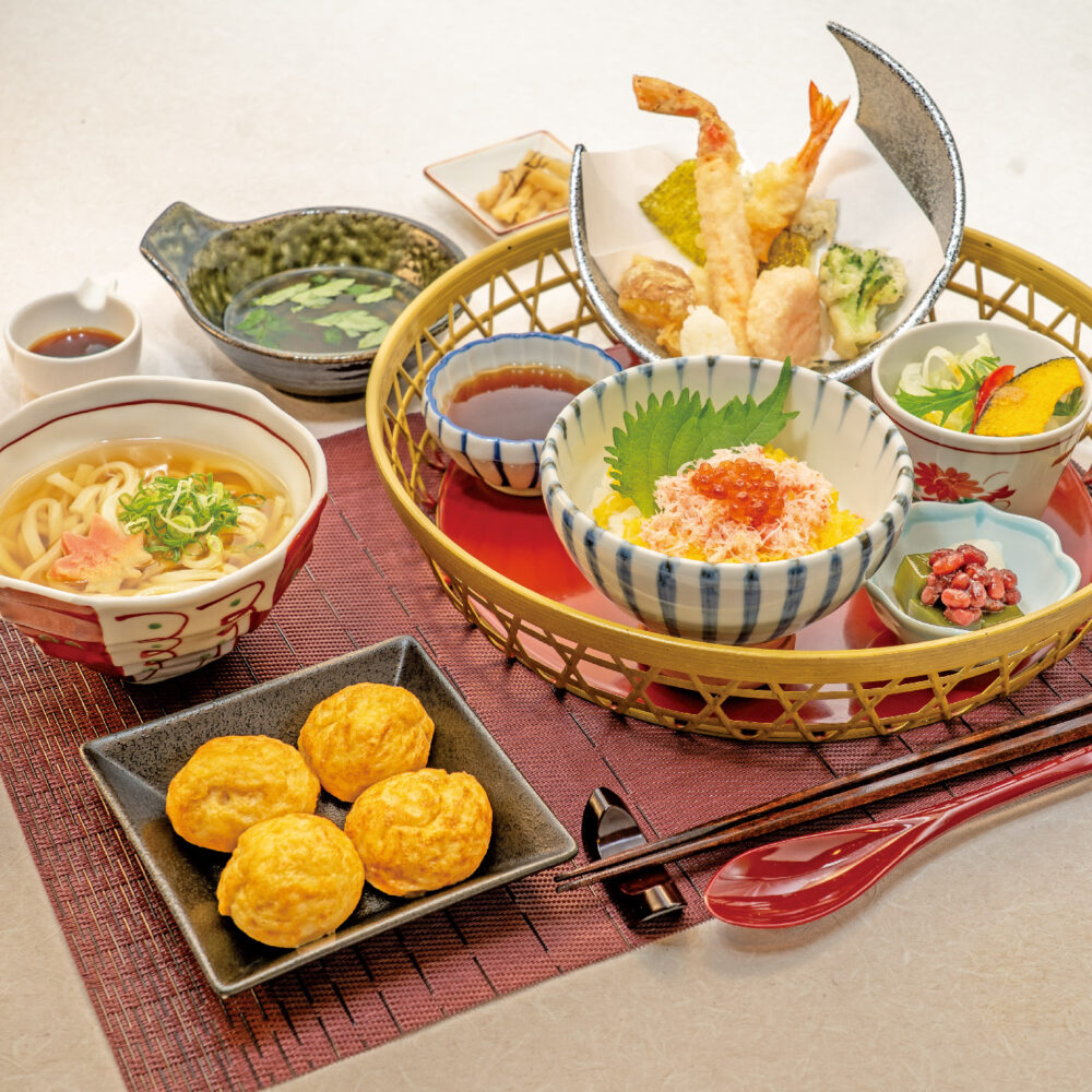 特製お出汁とふわとろ食感を味わう玉子焼(明石焼)、海の恵みの紅ズワイガニ・いくら、サクサク天ぷらは「本ズワイガニ」と旬の味覚とこだわり商品を一膳に。ぜいたくな御膳をご賞味ください。