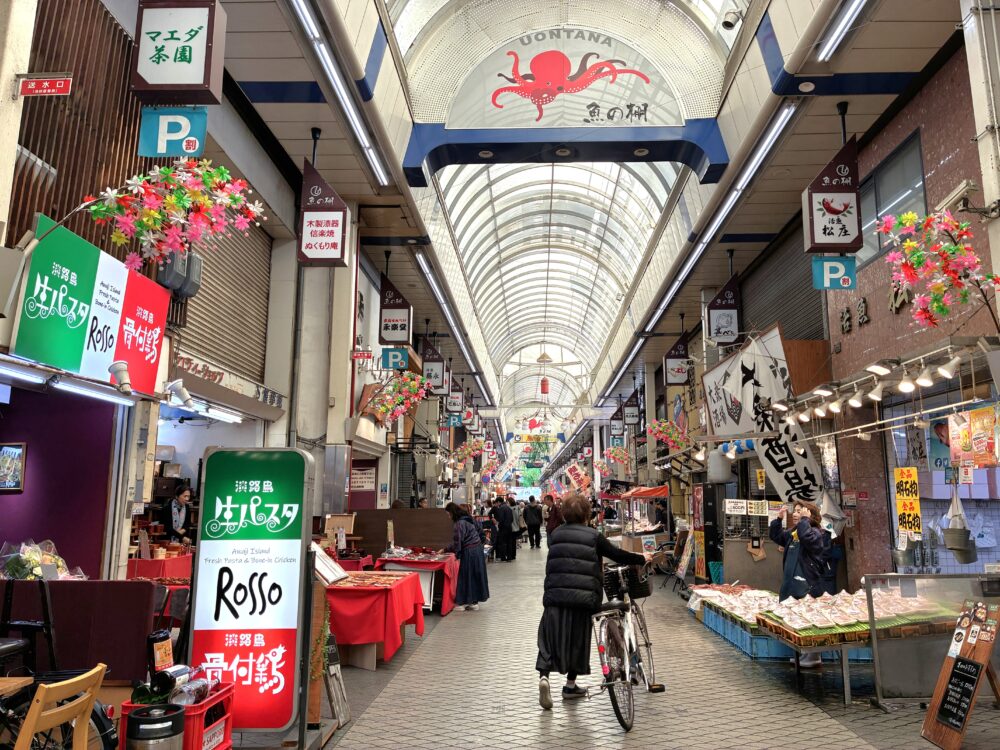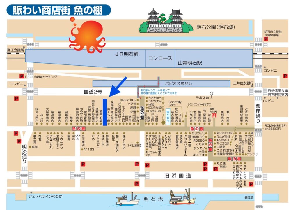 お店があるのは商店街のやや西寄り。パピオスあかしからデッキを通って直接魚の棚に入ると、ほど近い場所にあります。