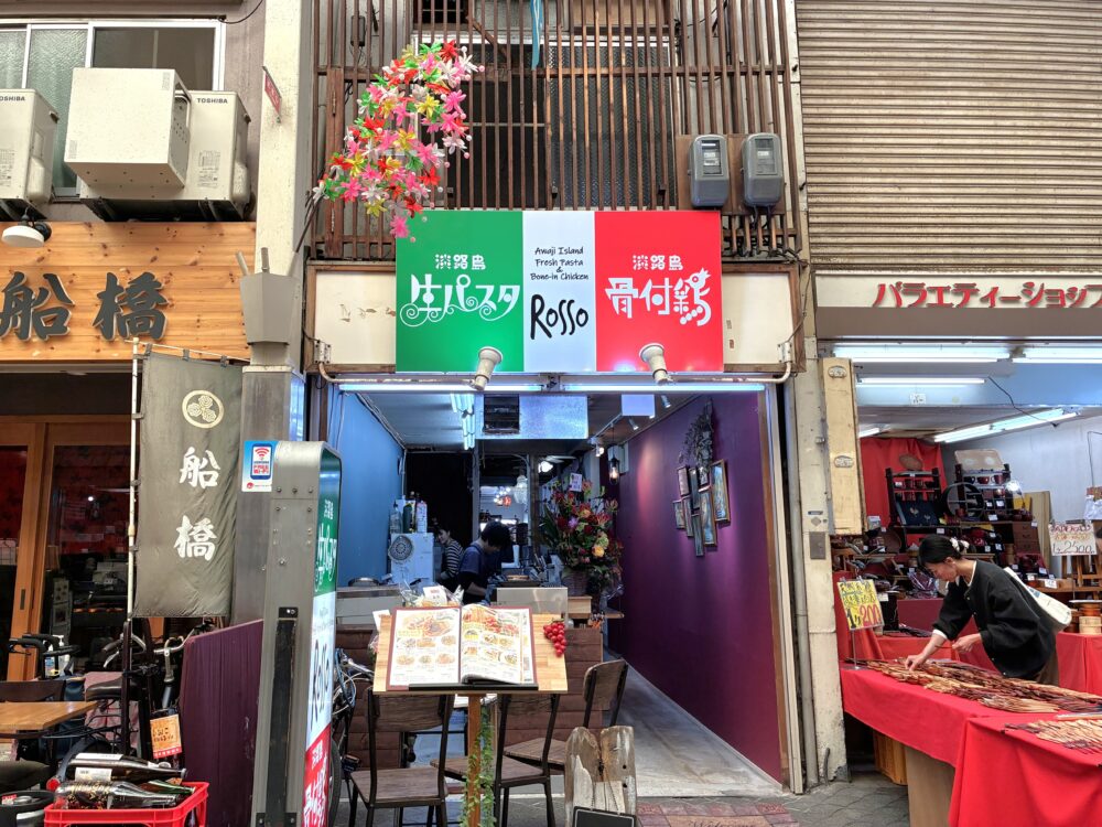 JR明石駅から8分、魚の棚商店街の中に『淡路島生パスタと淡路骨付鶏 ROSSO』ってお店ができてます。