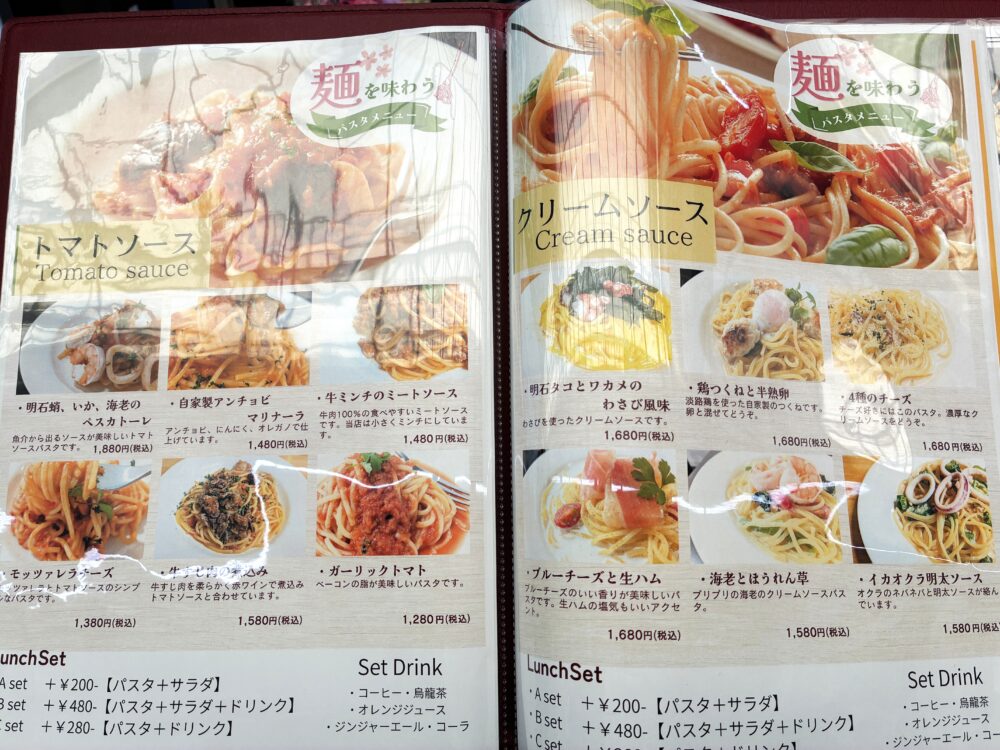 パスタの種類が豊富で、中には地元食材の明石蛸を使ったメニューも。+200円でサラダ付き、+280円でドリンク付き、+480円で両方つけることができます。
