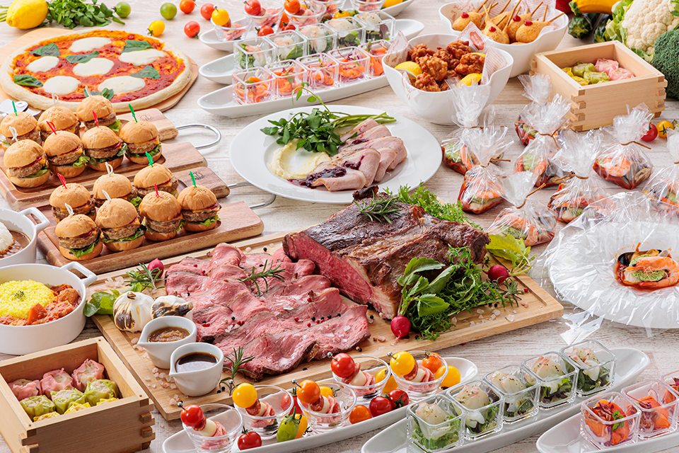 ローストポーク ベリービネガーソース/ピザ マルゲリータ/シーフードのフィルム包み/ミニハンバーガー/ミニアメリカンドッグ/ポテトフライ/チキンのから揚げ/色とりどりの中華点心/トマトチキンカレー/ビーフカレー/サフランライス/ポタージュスープ/パン各種/兵庫県産米の白ご飯