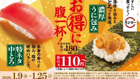 通常税込180円の「特ネタ中トロ」と「濃厚うに包み」が税込110円~提供されます。※店舗によって価格が異なります。