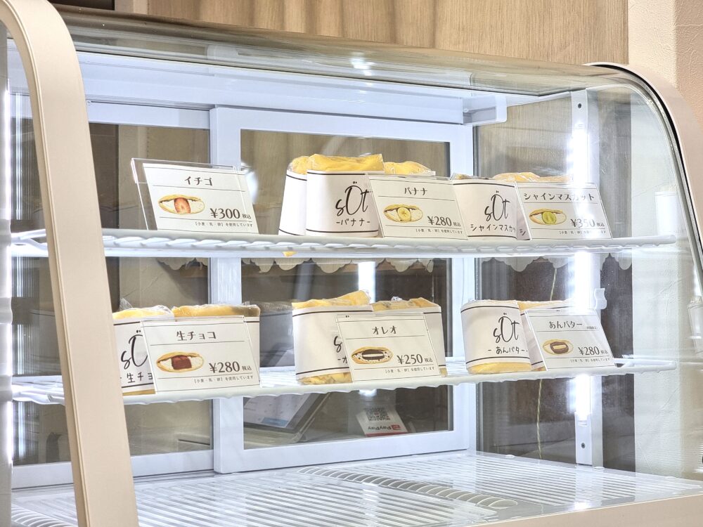 店内奥にはテイクアウト用のショーケースがあって、毎日6種類ほどの「ミニクレープ」が各種10個限定で販売されてます。1個250円からと手頃なお値段で、お土産などにも良さそうです。