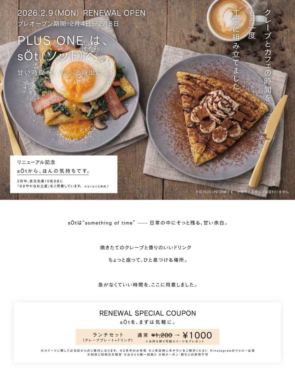 阪急 岡本駅ちかくにあったクレープ専門店「PLUS ONE」が『sÖt(ソット)』としてリニューアルオープンしてます。メニューが増えて「クレープランチ」などを楽しめるようになったみたいです。