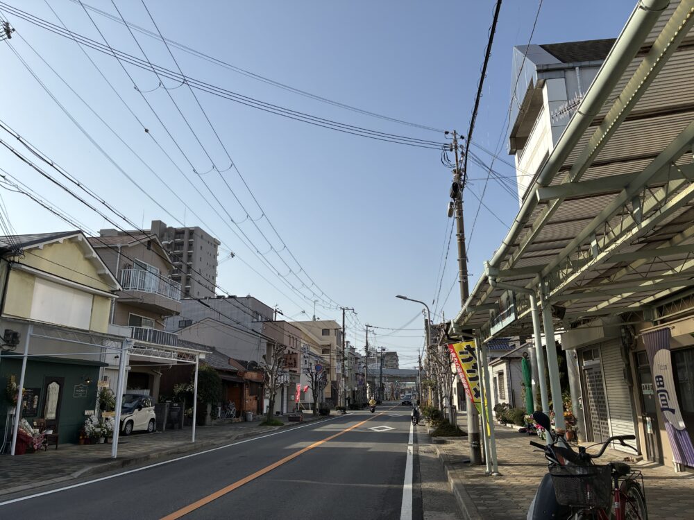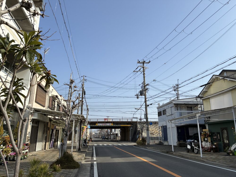 山側を向くとこんな感じ。すぐそばにはJR沿線の高架があり、さらに山側へ進むと「お菓子工房 toitoitoi」や「明石西新町郵便局」などがあります。