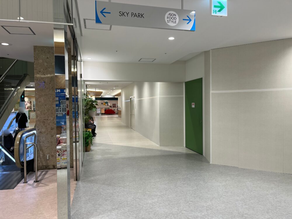 お店のすぐ近くにはエスカレーターがあって、下りると2階に、上がれば屋上広場「SKY PARK」へと繋がってます。通路の奥には「Dot Cafe familiar」っていうカフェの赤いソファが見えてます。