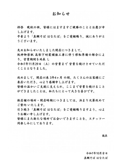 阪神御影駅の近くにあるラーメン店『真鯛そば はなたば』が一時閉店するそうです。