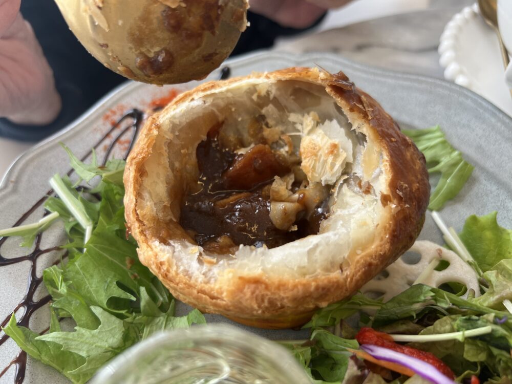 割ってみるとこんな感じ。パイも中のシチューも熱々なので、これからの季節にはぴったりですね。