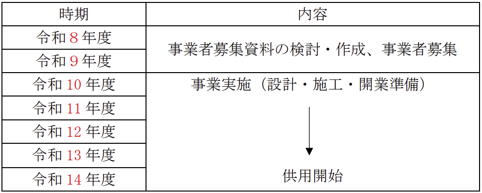 再び「事業者募集」を行い「2028年度」から設計・施工などを経て、2032年度には「供用開始」というスケジュールが目標となってます。